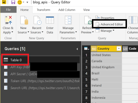 Now that we have our parameters in place, navigate back to the Table Query and click on “Advanced Editor”