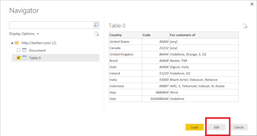 Back in Power BI, go back to the Web data source and we will just type in an arbitrary web URL as we will be replacing all of this with a script. I used http://twitter.com and was presented with the navigator dialog to select a table from that page. Click “Edit” to open the Query Editor.