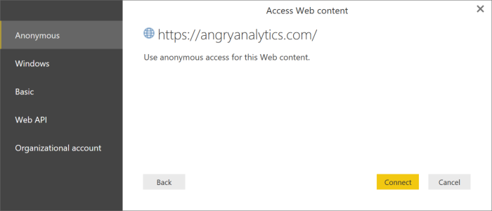 When connecting to a web URL for your internal (or external API) it is likely going to be a secured and will have a prefix of “https” instead of “http”. In our ODATA example above, I did not connect to a secured service but had I, the below dialog would have been presented back.