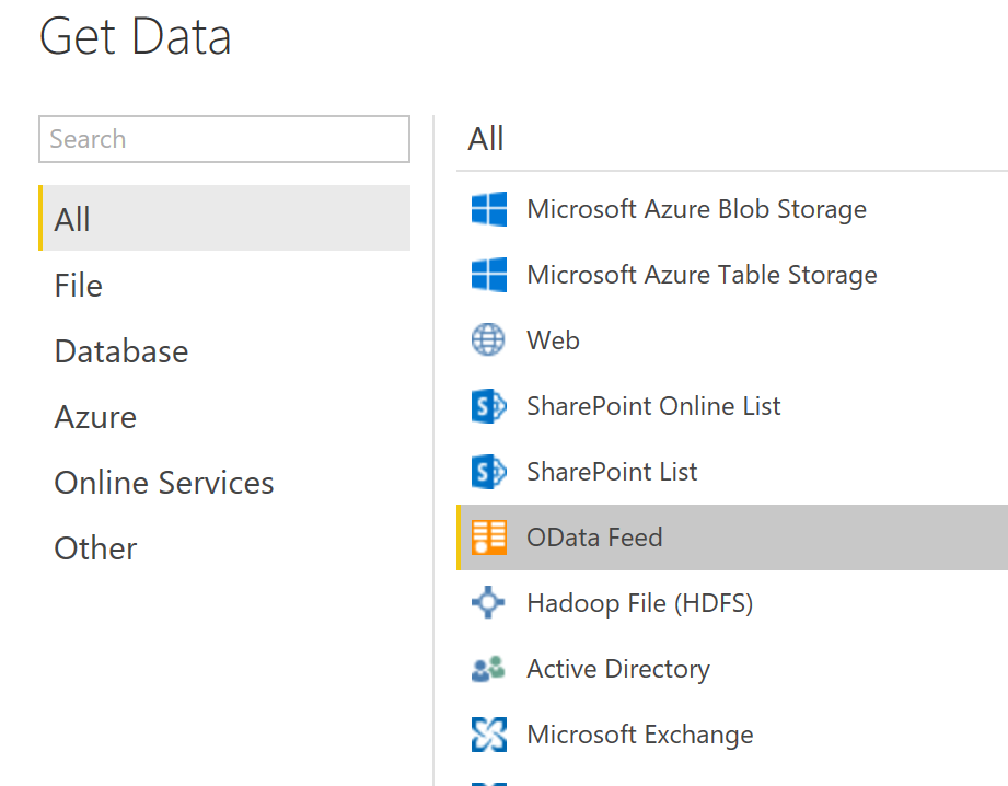 To connect to ODATA feeds, simply go to “Get Data” -> “ODATA” and enter the URL.
