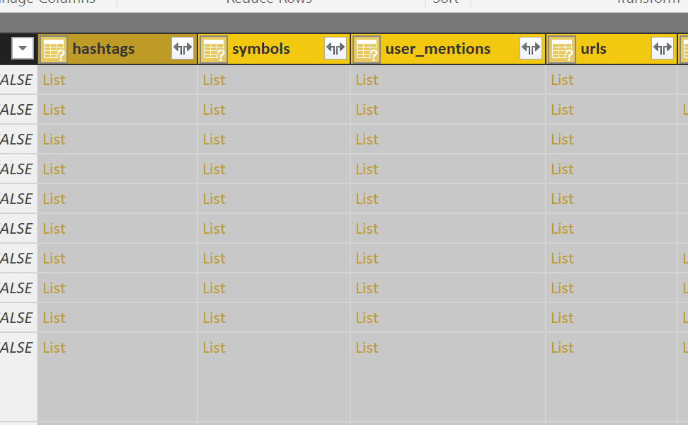 I am really impressed with the JSON parser that is built into the query editor of Power BI. For instance, when you look at the results of the JSON that gets returned in the Twitter API that we just connected to, it looks like this:
