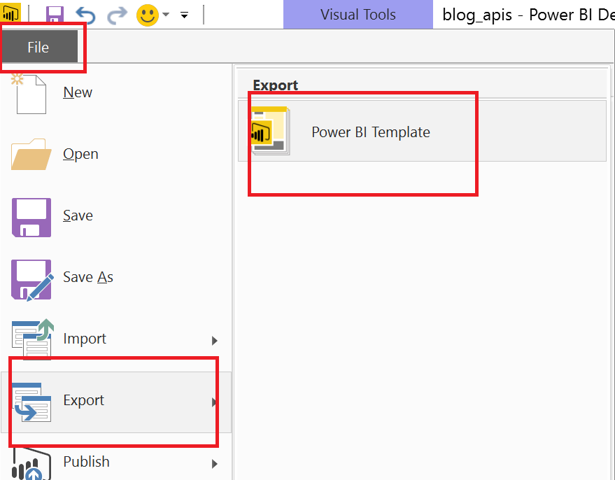 Another new feature in the April update of Power BI is the Power BI Template file. I have saved all of the above work in a template file that I am sharing by clicking the Export option from the File menu.
