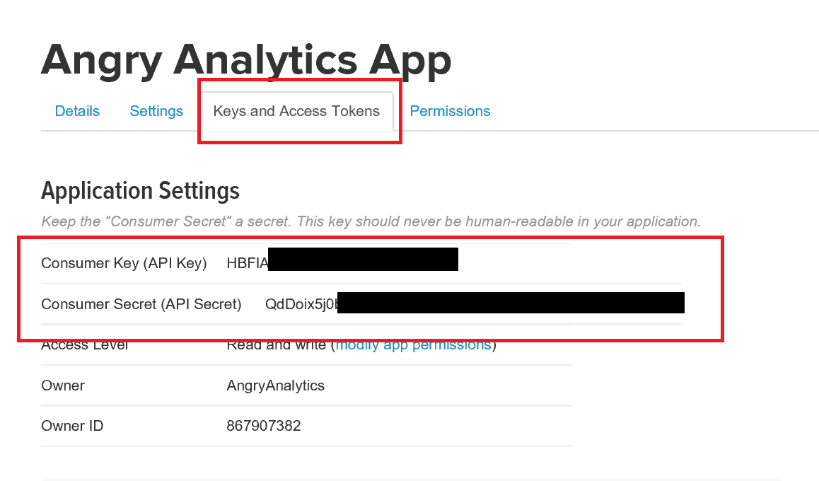 Once you have entered the data to create an application, you will land on your “App details” screen. Navigate to the “Keys and Access Tokens” tab and copy the API Key and Secret so they can be used later.