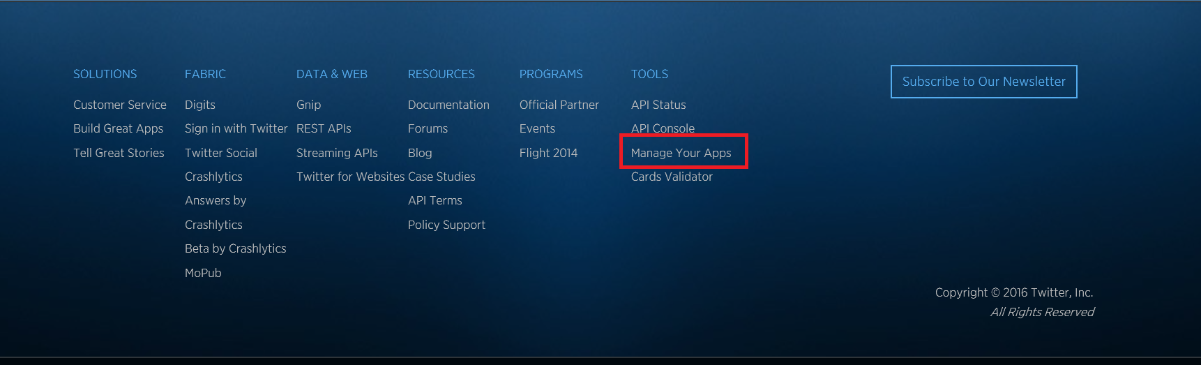 Go to https://dev.twitter.com and sign in with your twitter account. You will then need to create a twitter application which will give us the necessary API Key and API Secret that will be used to authenticate with the twitter Search API.