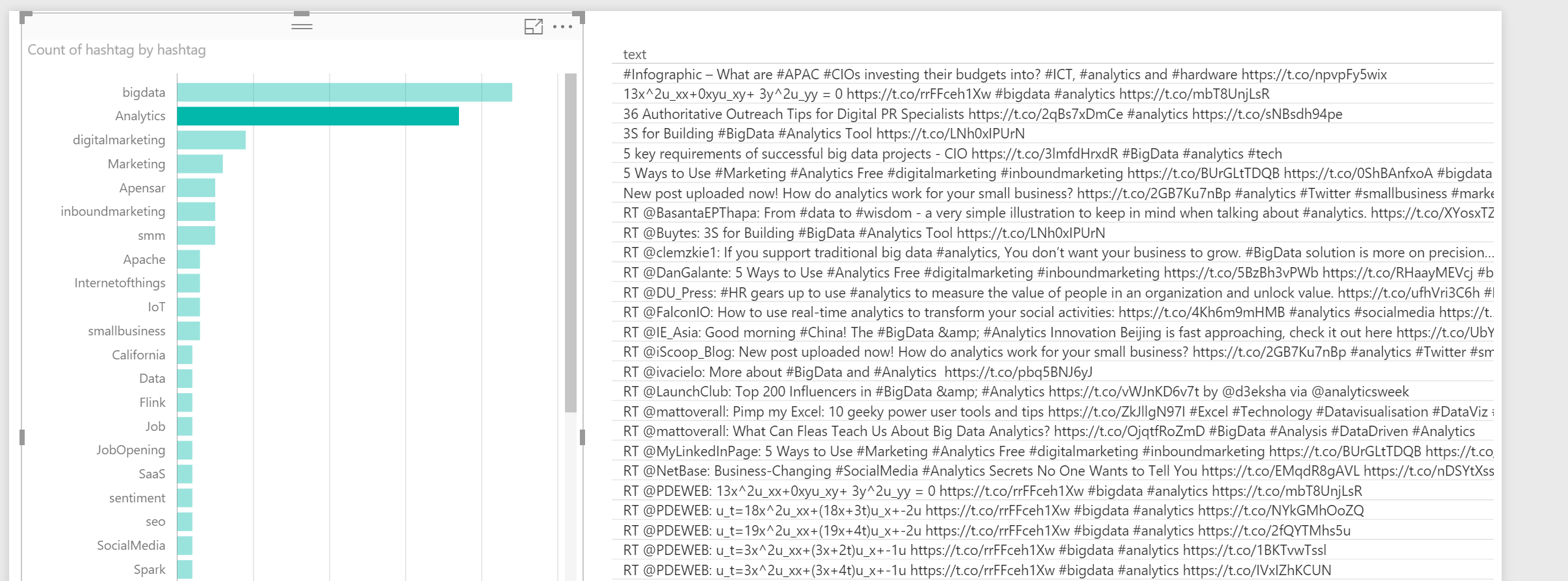 From here you can “Close and Apply” your Query Editor window and will have two queries. One for the statuses of your twitter search and the other for the hashtags that you can cross filter against.