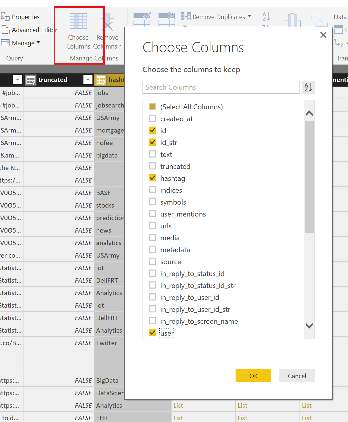 Now we can use the “Choose Columns” dialog to only select a few of the columns to reduce our query to just the information important to the hashtags.
