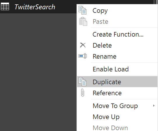 Let’s use this same result to create an additional query for hashtags. Simply right click on the “TwitterSearch” query and select “Duplicate”
