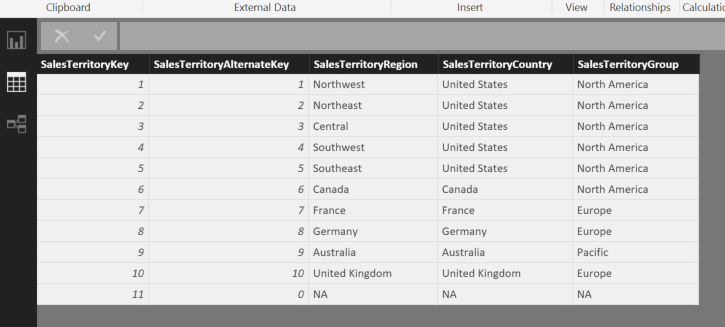 For this table I simply used a calculated table derived from the AdventureWorksDW DimEmployee table. I purposely excluded all the records that had a Sales Territory of N/A. See the DAX for this table below.