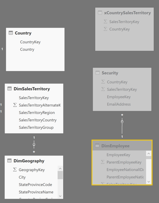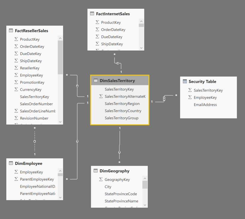 Pay attention to the new data model. Note that the relationship from DimSalesTerritory to the Security table has been removed. This change will be discussed a little later.