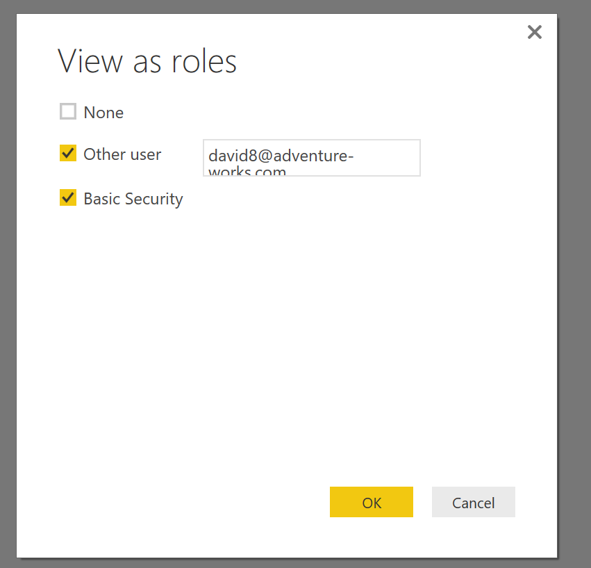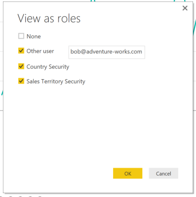 When we select “View as Role”, check the “Other user” box to use a user other than who is logged into the machine (because your email address is likely not in the adventure works DW sample database). Enter “david8@adventure-works.com”