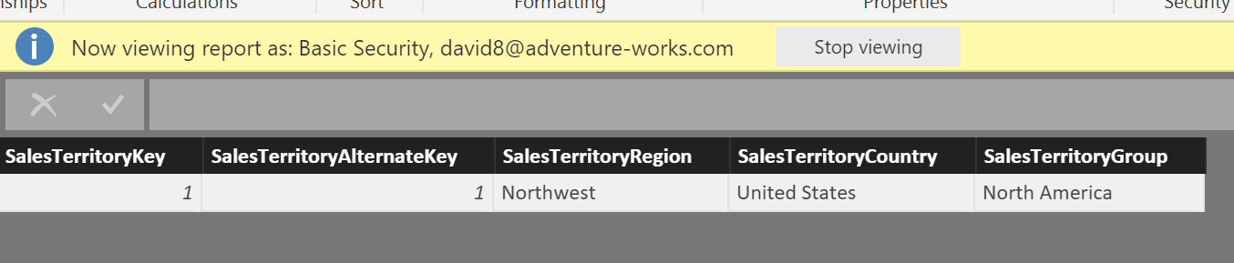When back on DimSalesTerritory in the table view, we can now see that the only territory allowed in this view is the Northwest United States