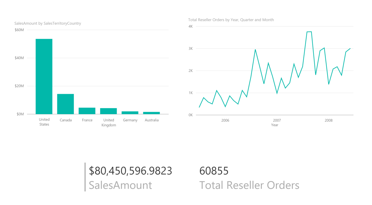 We can also review some simple visuals including a geography hierarchy bar chart, total orders over time line chart and a card. (This is all using the FactResellerSales data)