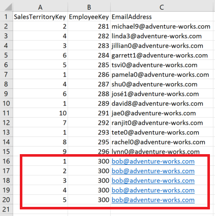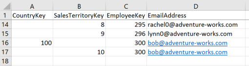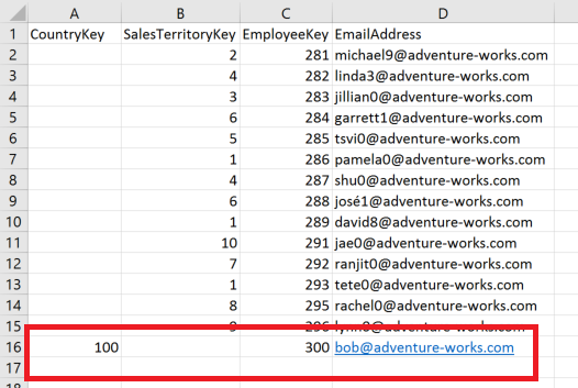 DimEmployee[EmployeeKey], DimEmployee[EmailAddress],