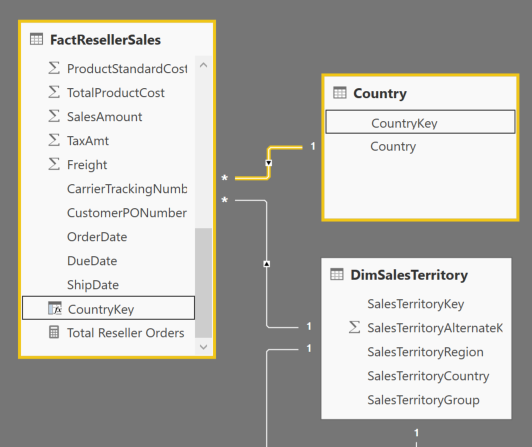 With CountryKey in the FACT table, now create single direction relationship from Country table to FactResellerSales via the newly added column. You would repeat this process for additional dimensions such as District and Store in a real world scenario.