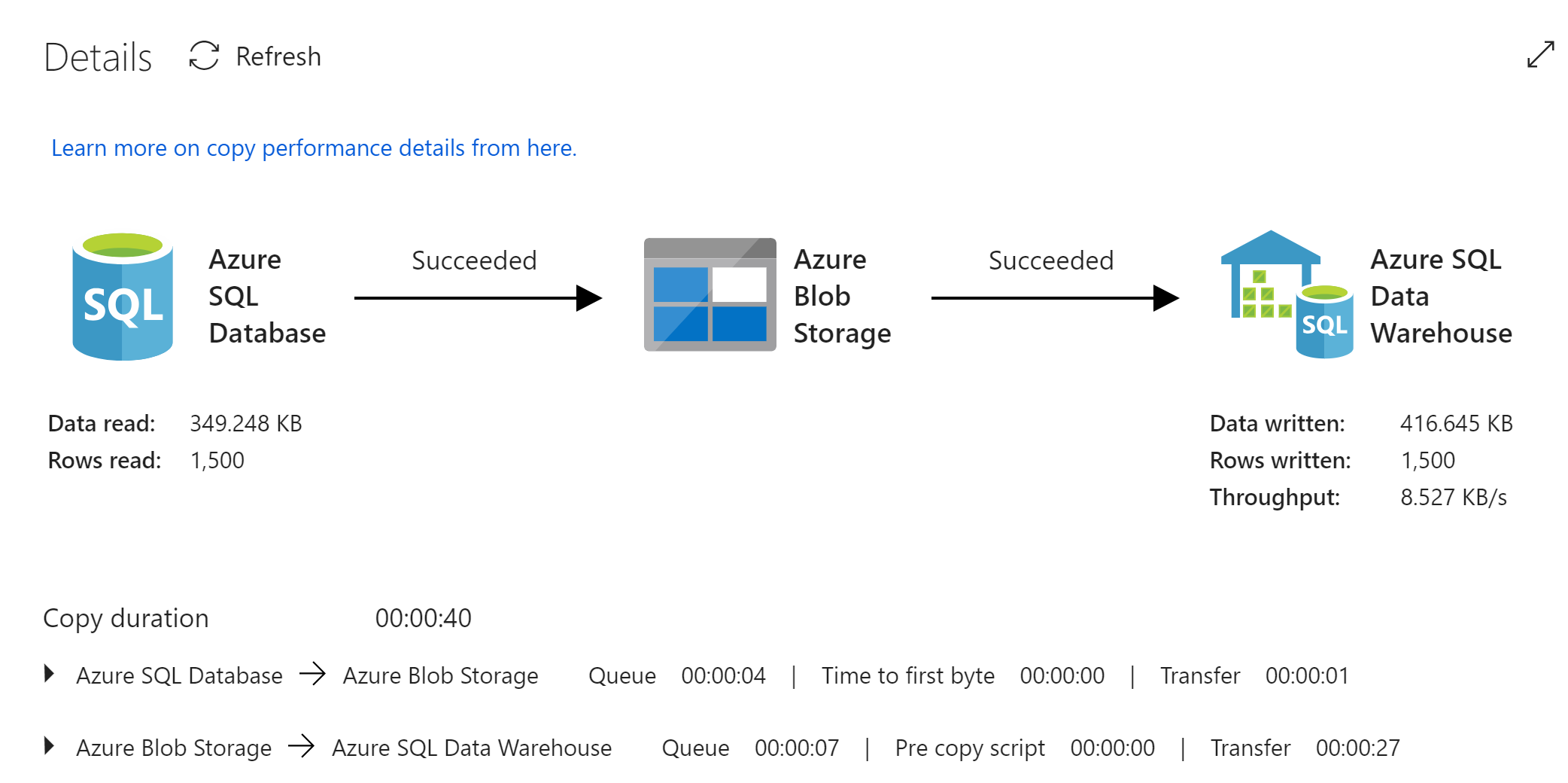 Reviewing the copy activity details, you should see 1500 records