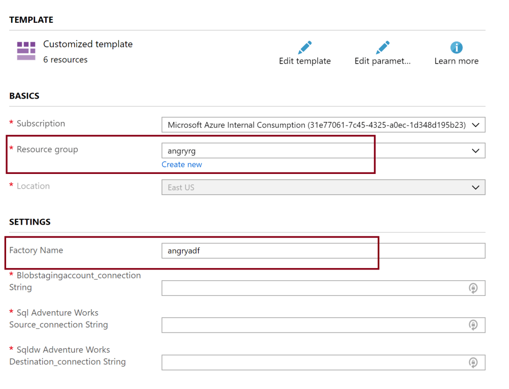 In the Azure Portal (https://portal.azure.com), create a new Azure Data Factory V2 resource. I named mine “angryadf”. Remember the name you give yours as the below deployment will create assets (connections, datasets, and the pipeline) in that ADF.