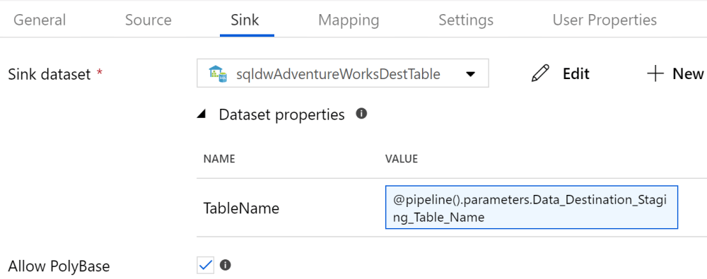 Note: As you can see from the above screen shot, I also prefer to parameterize the table name for the source and sink dataset objects. ADF has a bad habit of creating individual datasets for every table which gets out of control. The use of a TableName parameter allows you to create one source dataset and one sink dataset.