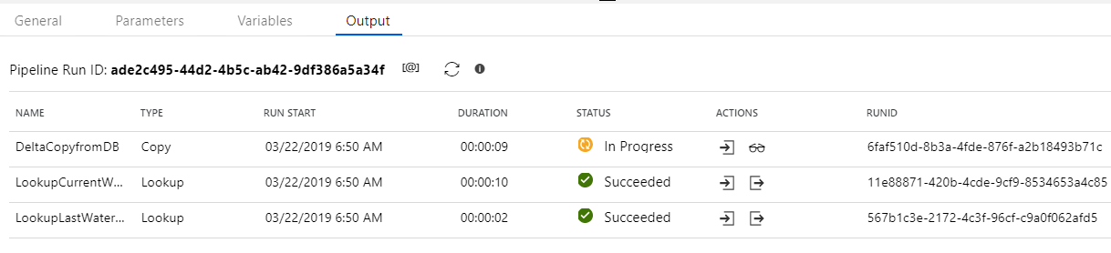 Run the pipeline again. Note you can review the outputs of the first two lookup activities by clicking on the actions icon below.