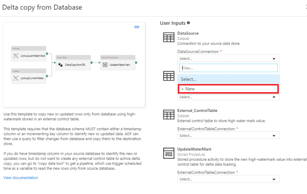 - Creating watermark table and update_watermark stored procedure (explained in detail in the base delta load template: https://docs.microsoft.com/en-us/azure/data-factory/solution-template-delta-copy-with-control-table)
