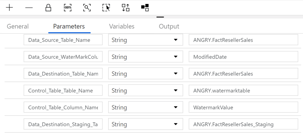 Using Parameters to pass into the pipeline is how you can keep it generic to work with any delta load. I have added defaults to all of them to work with this example and one additional parameter has been added for the destination staging table: