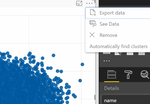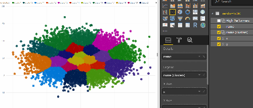 You can also use “…” in the upper right of the scatter chart to automatically detect clusters. Our example again is a bit uninteresting due to it being a random normal distribution but gives you an idea of how you can cluster data that is more meaningful.